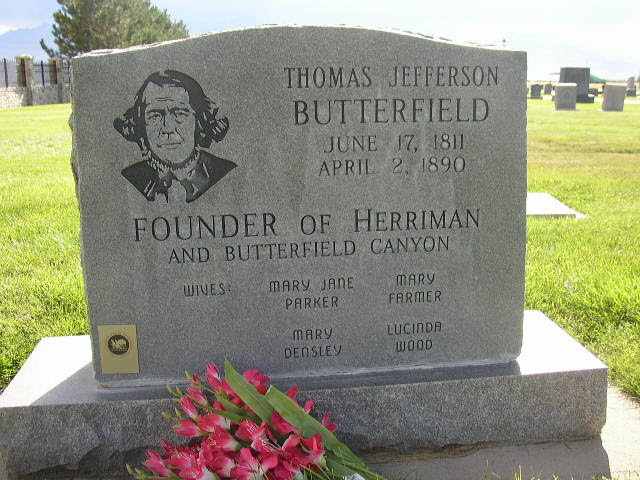 In 1850 Thomas Butterfield was living in West Jordan. In the spring of 1851, while searching for fresh water and a place to raise their livestock and families, he and Samuel Egbert found a small stream of water flowing from a canyon. He later returned and further explored the area, then moved his family, sheep, cows, oxen, horses and bees to the site he had chosen. With the help of his family, he plowed a ditch, erected a cabin, planted crops and cut firewood to prepare for the coming winter. In the next few years the Thomas Butterfield family was joined by others. The area became known as the Butterfield Settlement. After Henry Herriman, Thomas Butterfield was called to be the second presiding authority of the area until he left on a mission to the Salmon River area in 1855. After coming home, he married his second wife, Mary Farmer.